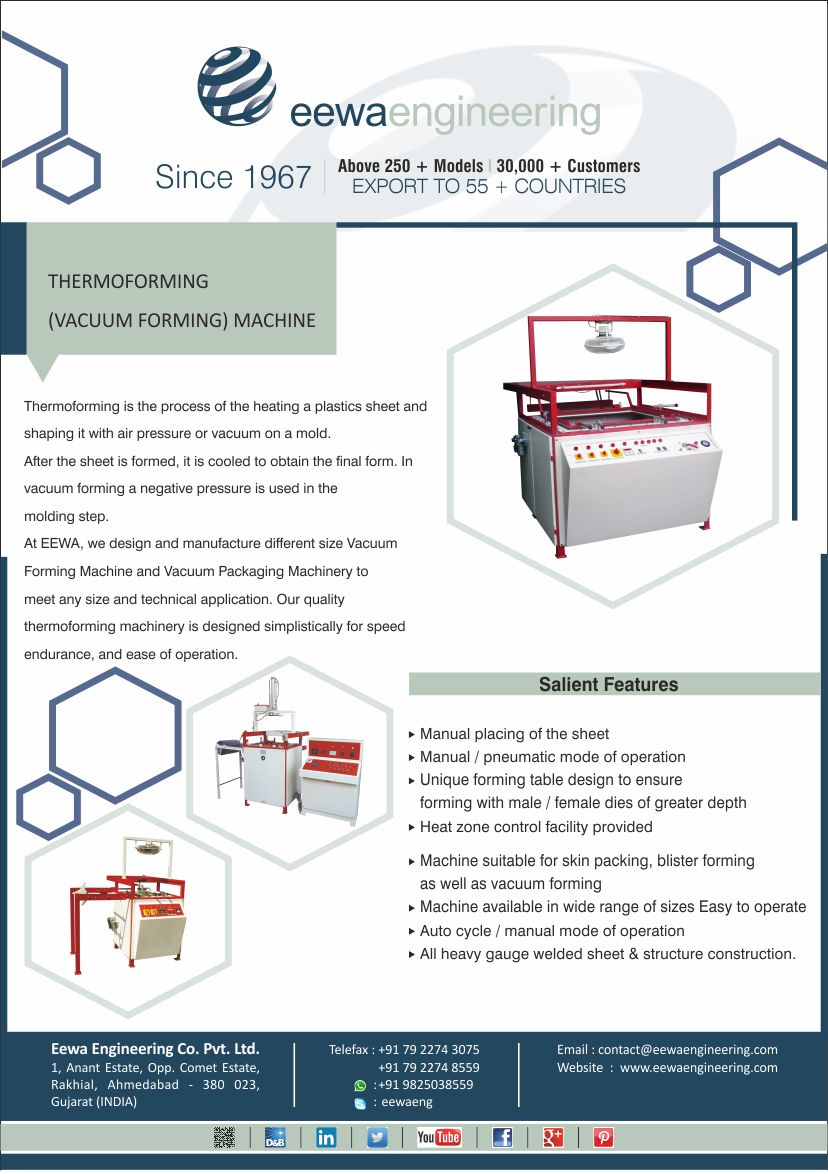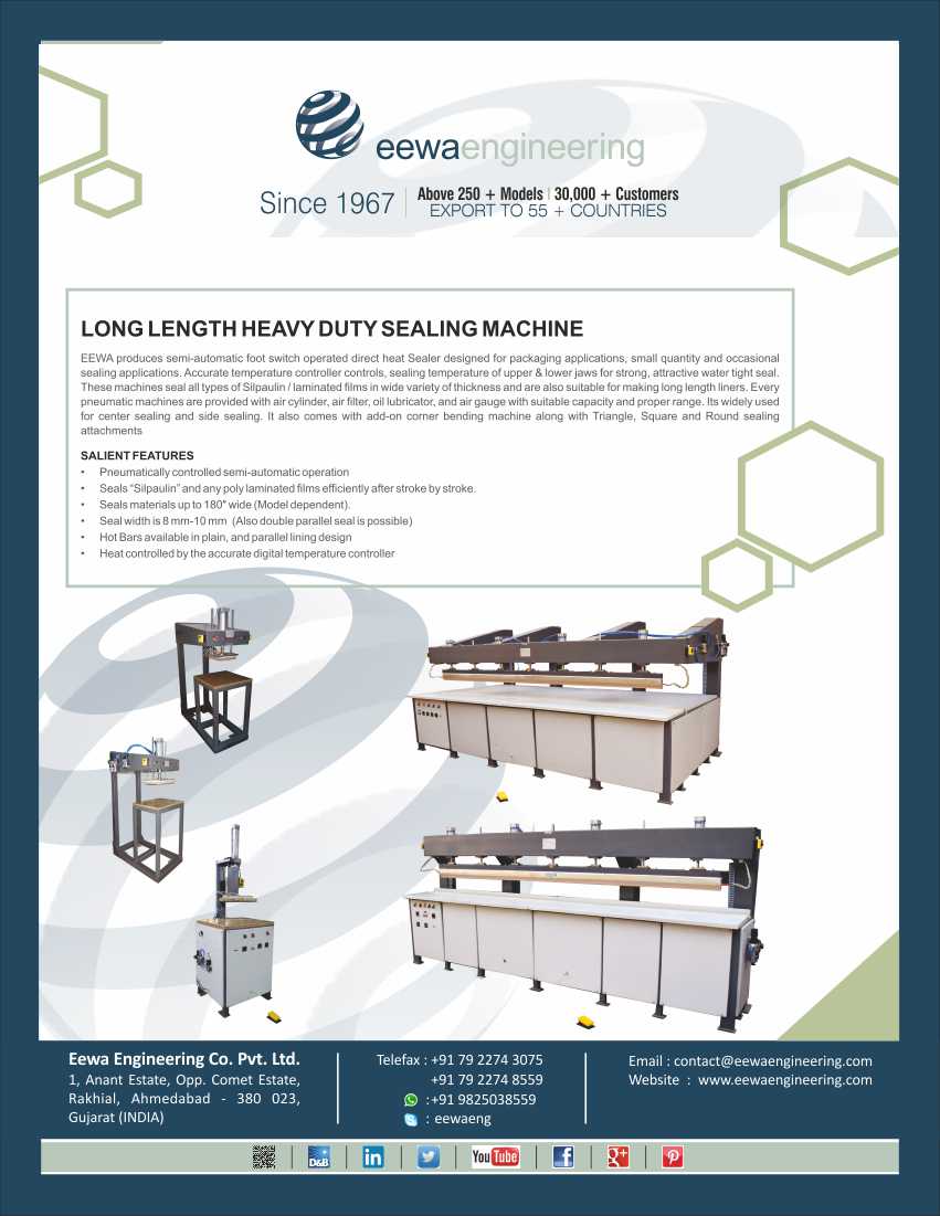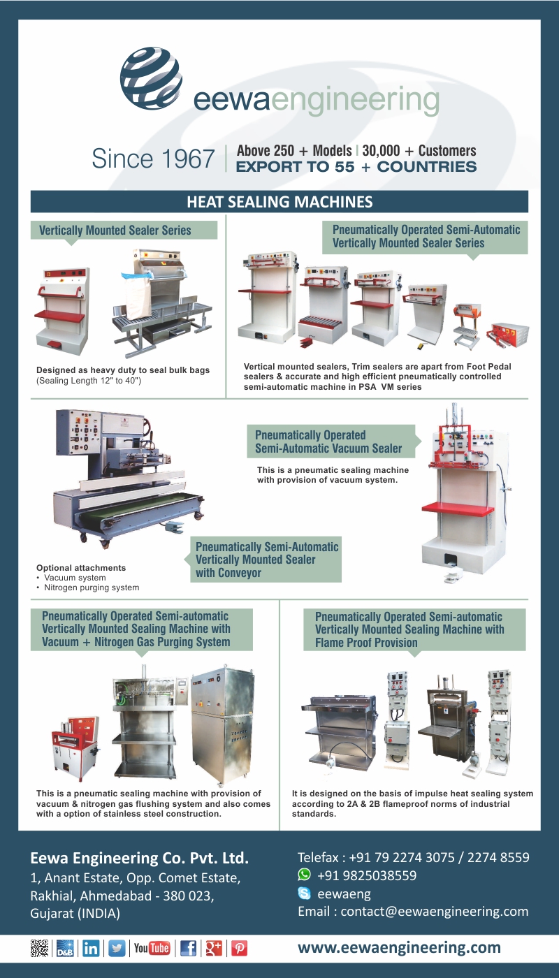 The fountainhead of quality in products is fed by a sustained corporate commitment to fulfilling customer demands. Eewa Engineering Company Pvt. Ltd. has grown from manufacturing Impulse Heat Sealing Machinery to being a major corporate player and market in the manufacture of a multifaceted range of products in Sealing and packaging machinery. Drive Force of Eewa: Established in 1967 Experience of more than 51 years Above 250+ Models More than 30,000 satisfied customers from all over India and Overseas Primary focus on developing Custom-Made Machinery to suit all applications and of a vast industry.