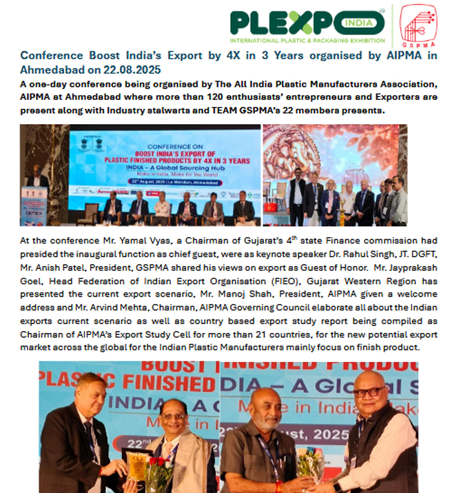 Conference Boost India’s Export by 4X in 3 Years organised by AIPMA in Ahmedabad on 22.08.2025 A one-day conference being organised by The All India Plastic Manufacturers Association, AIPMA at Ahmedabad where more than 120 enthusiasts’ entrepreneurs and Exporters are present along with Industry stalwarts and TEAM GSPMA’s 22 members presents..